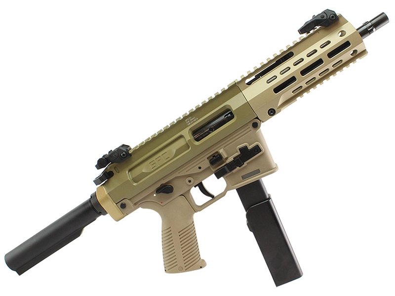 The SPC was developed for a European Police agency who requested a pistol-caliber carbine with similar features and ergonomics of the AR platform. The SPC utilizes a dual charging handle option, a classic AR-15 style charging handle and a non-reciprocating, folding charging handle above the barrel. This design allows the user to manipulate the weapon per their preference. Both options are ambidextrous.