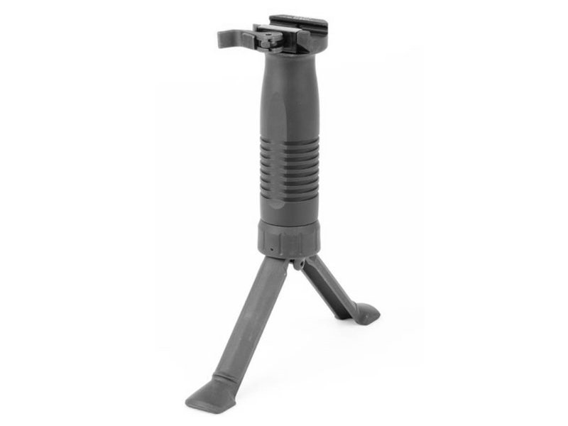 B&T Quick-Detach Vertical Grip with Bipod. Attaches to NAR/Picatinny rails with a QD lever. Features a stowaway bipod within the grip.